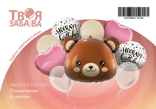 Набір латексних кульок (Голова ведмедика) Повітряні кулі з малюнком підходять для надування повітрям і гелієм. Купити за оптовими цінами набір латексних кульок ТМ "Твоя Забава", можна в нашому інтернет-магазині. У набір входить: -фольговані кульки 2 шт...